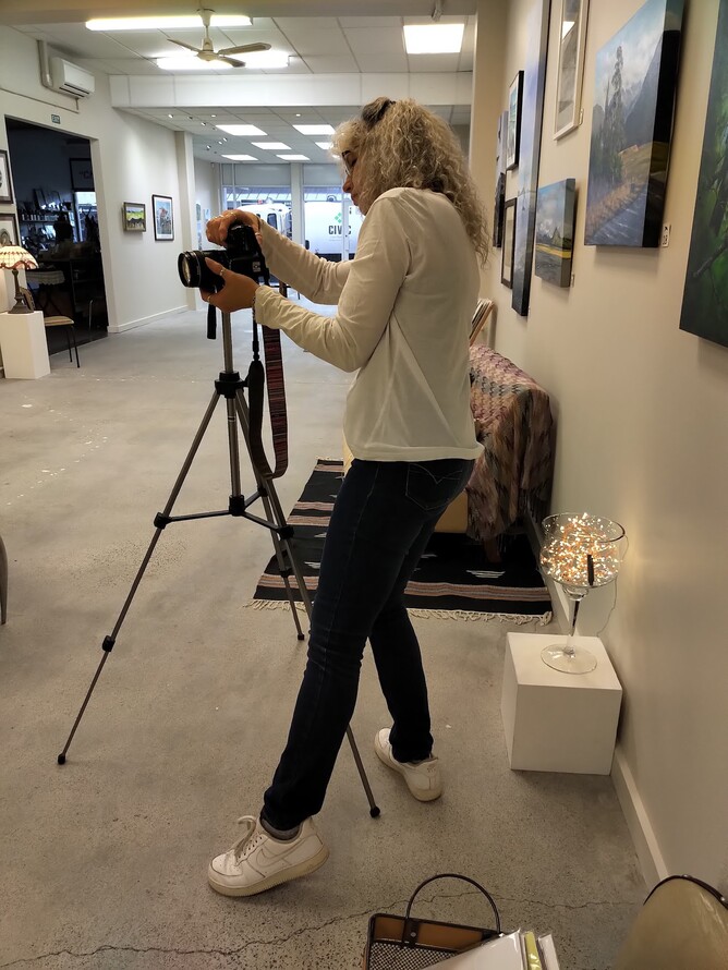 The Welcome Swallow Gallery has responded to the demands to create online experiences by photographing and filming the latest exhibition, making it possible to see the paintings both in situ and via video walk-through. Board member, gallery artist and noted photographer, Sandra Barlow can be seen here applying her own particular 'lens' towards the new exhibition. This is a method pioneered by Ailene Cuthbertson for the Waikato Watercolourists exhibition earlier this year. The exhibition, A New Zealand Story, has been further magnified by placing HD photographs of the paintings side by side with their gallery position. Aptly this additional "Barlow lens" carries out the same function as its astronomical namesake (if you are scratching your head, it's worth a quick google search!)