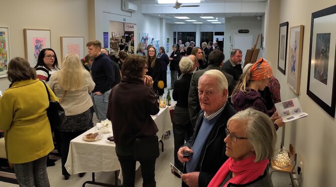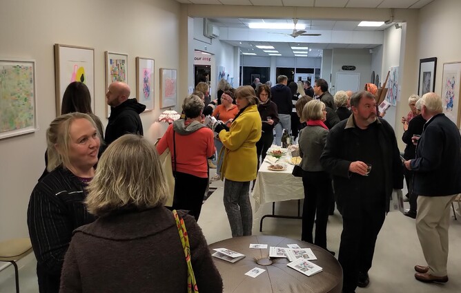 Despite a cold New Zealand winter's night, 100 avid art lovers gathered to celebrate the launch of, "It's all in the Mind" at the Welcome Swallow Gallery. CEO and Trust Chair, Dorothy Gilson noted that this was the first exhibition since the lock-down and that it was gratifying to see so many people attending. She pointed out that successful exhibitions raise funds that enable women's refuges in the Waikato to fund children's play therapy programs.