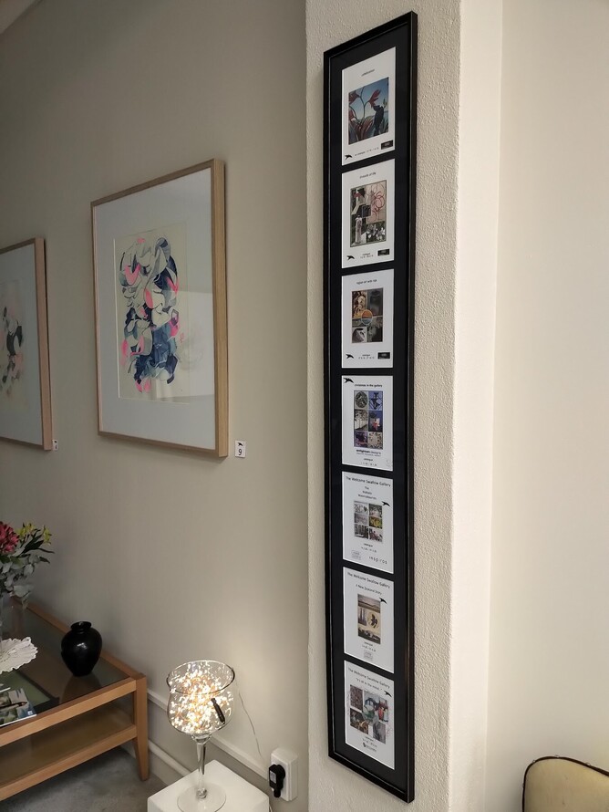 Since May of last year the Welcome Swallow Gallery has curated seven exhibitions, each captured in a catalogue that contains details of all compositions together with an art commentary and bio of each of our artists. Proud to display in the gallery, this framed arrangement of each catalogue cover.