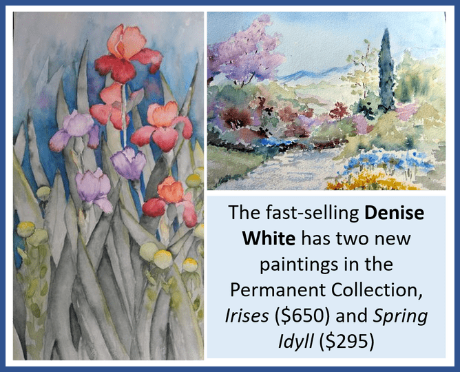 More gorgeous watercolours from the brush of Gallery artist, Denise White. Two compositions for the Permanent Collection that feature a vibrant Irises painting and an impressionist promise of a Spring Idyll to come. Now on display.