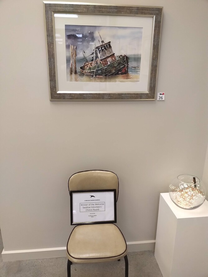 The highlight of the evening was the Volunteers' Choice Award that was taken out by Gavin Smith's watercolour composition, Grounded (see below). Gavin receives a certificate and a cheque for $250 from the Gallery Trust Board. Unsurprisingly, by evening's end, the painting had been sold to a local collector.