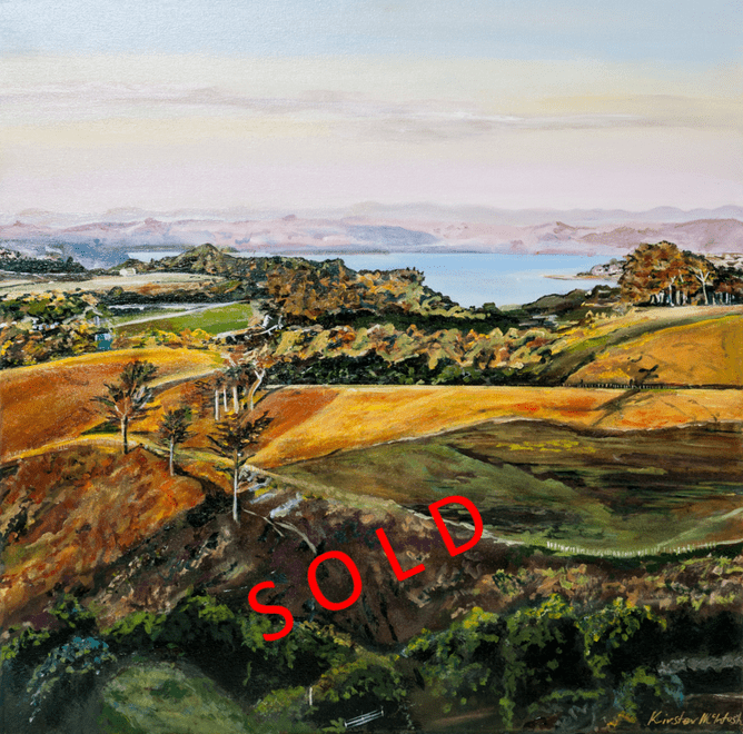 Sunset on Raglan Hills provides a gorgeous vista that takes the viewer through luscious greens to burnt orange fields, a delicate blue bay and finally distant hills tinged in pink.