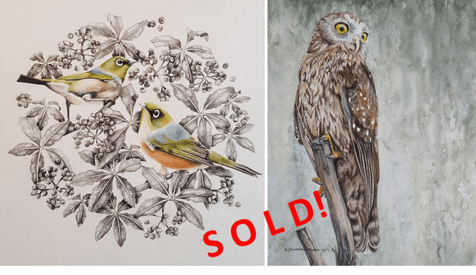 These exceptional feathered works of art, by Helen Cairney's, Waxeyes I and Rebecca Dowman-Ngapo's, A Long Awaited Visit - Morepork Otorohanga Kiwi House and Native Bird Park, have taken wing to nests anew.