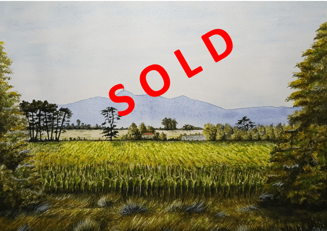 For three weekends in a row, Gallery artists Sandra Barlow's watercolours have attracted buyers from overseas and in New Zealand. The most recent sale is Te Aroha that curiously captures, as the central feature of the composition, a distant obelisk atop a range of hills. A maize crop in the foreground with farmstead nestled in the centre of the painting completes an evocative quintessential New Zealand rural setting.