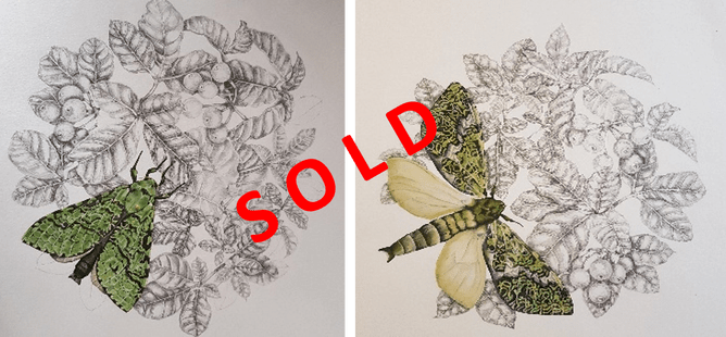 Helen Cairney's superb artistry continues to appeal to Welcome Swallow Gallery art lovers. Featured here are delicate representations of the Puriri moth at rest and in flight.