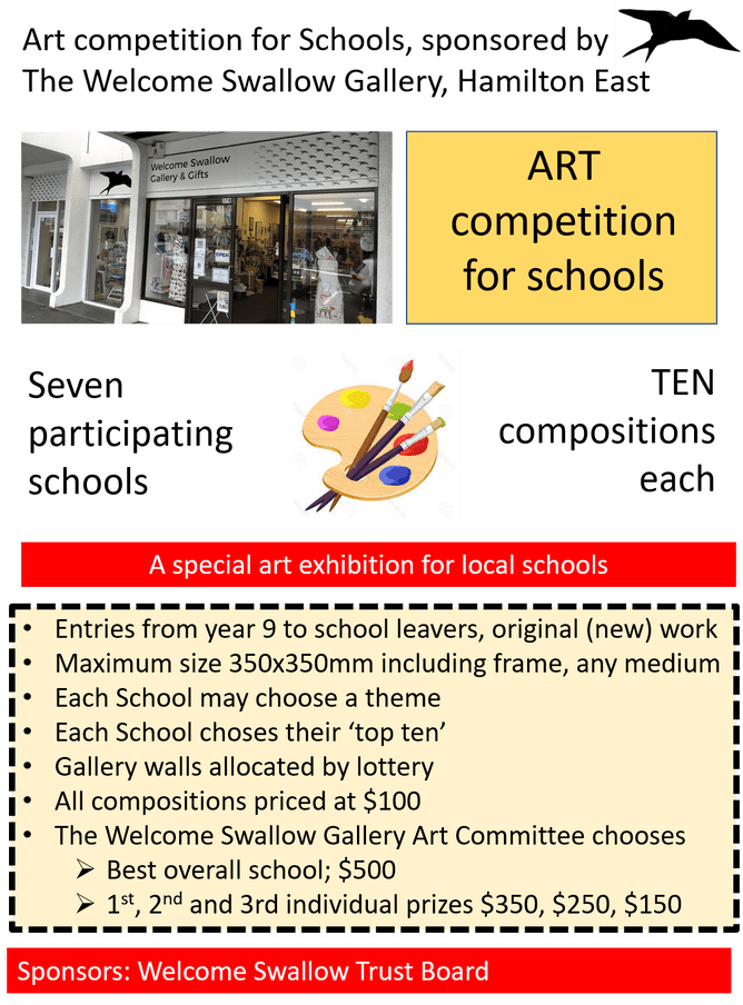 In April 2021 The Welcome Swallow Gallery will be hosting a special competition for schools in the Waikato. In addition to raising funds that support charities for children, the gallery is also committed to help the development of the art community. This includes future artists from our schools. We are excited to be opening up our wall space to provide these young artists with an established public platform. See below for further details of the upcoming competition.