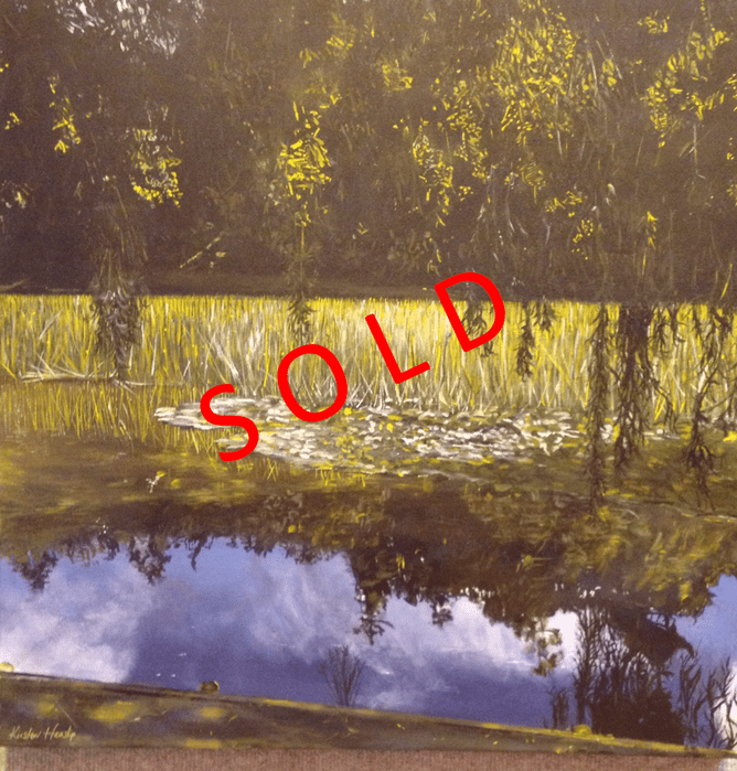 Summer Reflections at Lake Te Koutu, by gallery artist, Kirsten McIntosh has always attracted intrigue from gallery browsers who frequently study the rich mirror images portrayed in the lake. The composition that is dominated by a lush green colour palate is interrupted by lake water that dramatically brings the blue sky and white wisps of cloud to ground level.