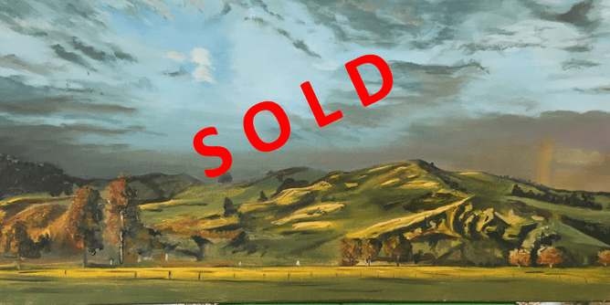 Kirsten McIntosh has quickly established herself at the Welcome Swallow Gallery as a much sought after artist. Her latest oil composition to leave the Gallery, Fencourt Hills, demonstrates a clever use of yellow fleck that accents the variegated gradients of the undulating landscape. With yellow being the first colour that hits the retina, the viewer is instinctively drawn to the painting.