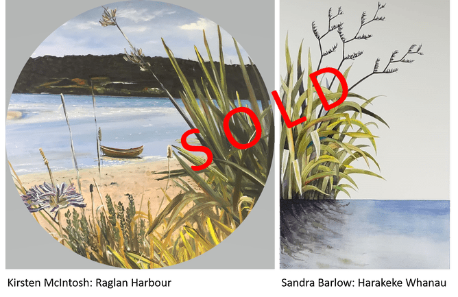 Both Sandra Barlow and Kirsten McIntosh continue to attract collectors who are buying their compositions on a regular basis. Sandra Barlow's watercolour, Harakeke Whanau draws the viewer towards the dead calm water that contrasts sharply with the explosion of chaotic flax leaves that are accented with a range of delicious colours. Calm and chaos co-exist.