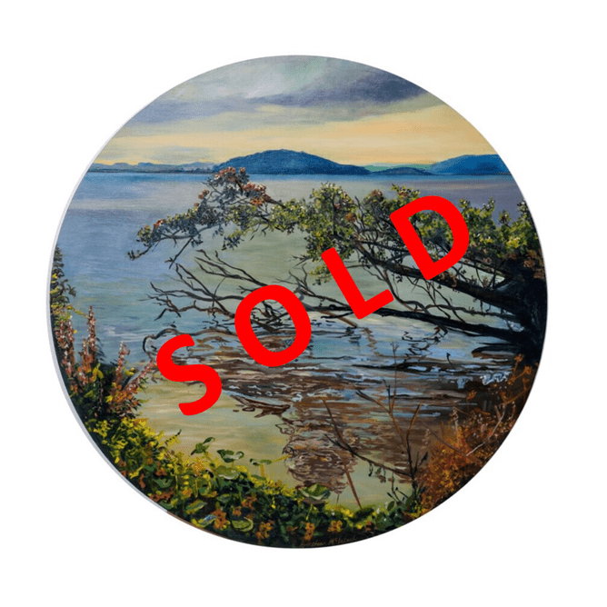 From the Permanent Collection, Lake Edge, by Gallery artists Kirtsen McIntosh, is a superb roundel in oil, hand-painted on box canvas with several acrylic and oil layers that build colour and depth into the composition. The artist captures the lingering Pohutukawa tree that cast reflections in the water drawing the viewer to examine both place and context.