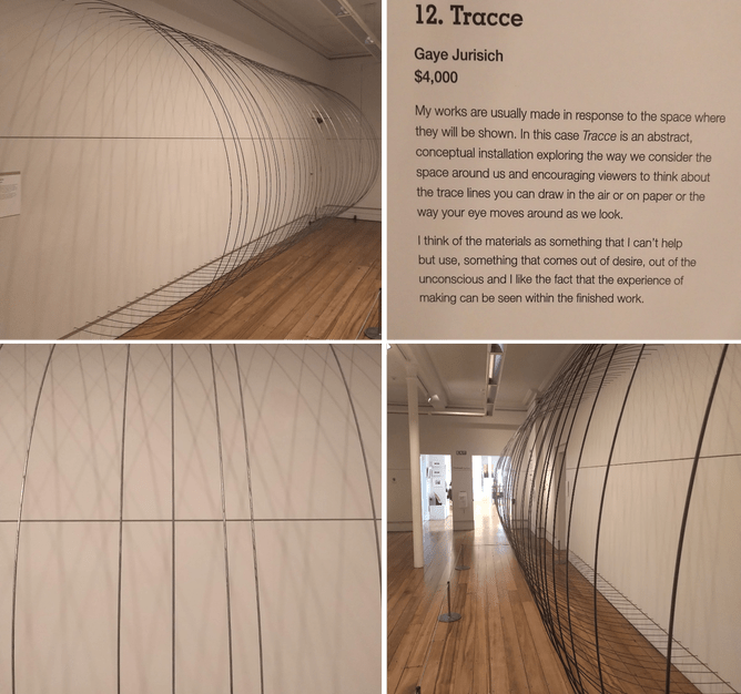 As with her installation, Still, recently seen at the Waikato Museum Te Whare Taonga o Waikato, Tracce makes a bold statement, dominating the room in which it is situated. Similar to some of the larger threaded installations presented by Palestinian artist, Mona Hatoum, Jurisich tantalisingly invites you towards and into a space that is actually not available to you. The viewer has to be content with a mental interaction while enjoying the symmetry and the reflective capacity of the installation. It is both disruptive and calming at the same time.
