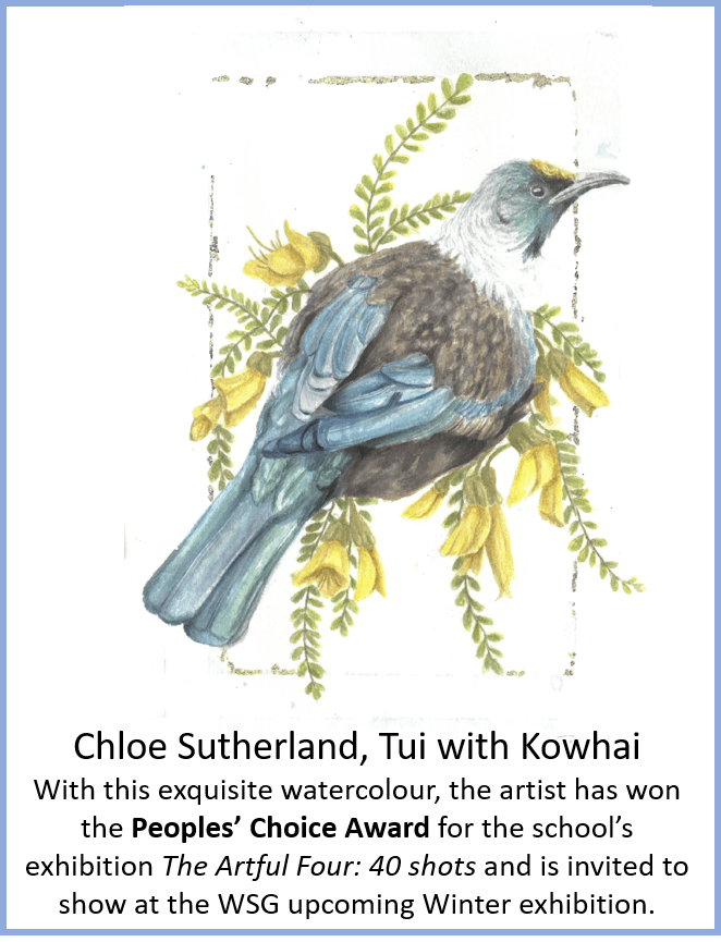 Winner of the People's Choice Award from the schools' competition, The Artful Four: 40 shots, is Chloe Sutherland's beautiful watercolour, Tui with Kowhai. Congratulations to her and Hamilton Girls High. Chloe will now be presenting at the upcoming Gallery Winter exhibition entitled, Winter Bright.