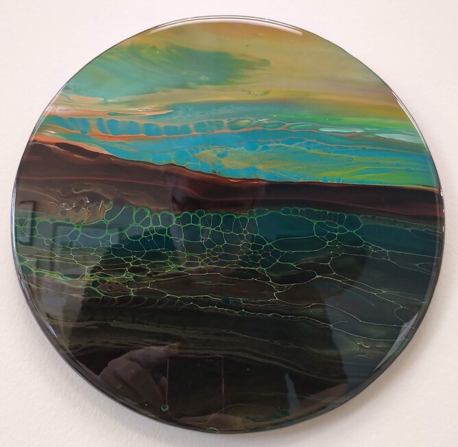 Toni Kingstone's acrylic / resin compositions continue to attract buyers. Mining for Gold, with rich textural contrasts, including strong reflective properties, has now found its new home.