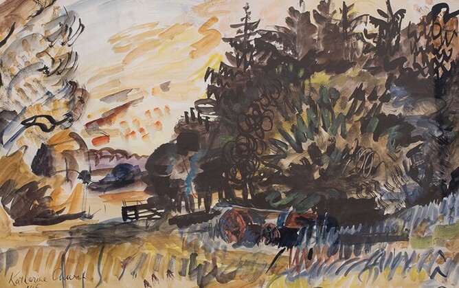 June Evening in Buckinghamshire was painted in 1945 and demonstrates Church’s use of strong gestural lines, reminiscent of Monet’s dashes and daubs that create compositional movement and energy.