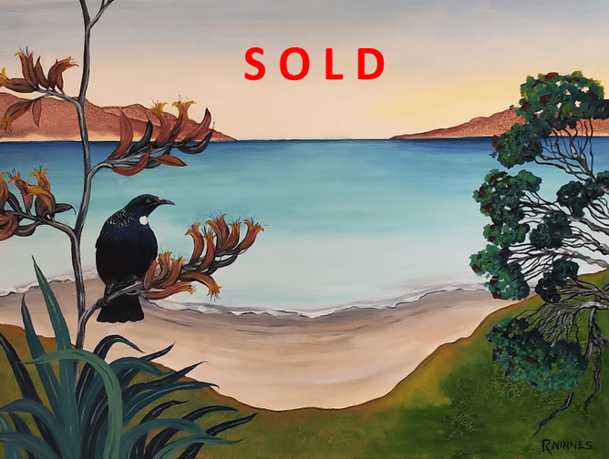 Stylized Tui's from Robyn Ninnes, here witnessed in the composition, Watchful Tui's, have long been favourites of the Welcome Swallow Gallery goers. Now sold from the Permanent Collection.