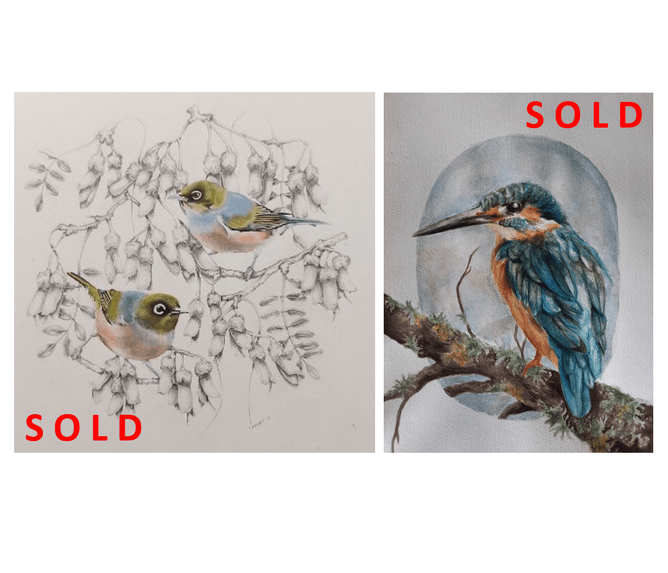These two exquisite compositions by Helen Cairney and Chloe Sutherland were greatly admired on the opening night of the exhibition, Winter Bright. Waxeye Visitors III and Kingfisher both exemplify the traditions of the gallery in terms of fine art that represents New Zealand bird life. Both sold to a discerning local collector.