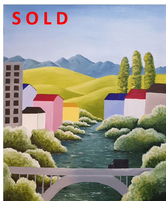Like all artists I am attracted to many genres and methods. I reflect on the feel of Don Binney and the moderne senses of Rita Angus. For this composition, I wanted to capture the essence of Hamilton, to be within grasp with a simple glance without reference to location, geography, or perspective. To create this effect, I heavily stylized the buildings that do not especially interact with the main feature of the city – the Waikato river. In simple terms, despite many attempts, the city has never truly interacted with the mighty river. Hence the title Awa Crossing. That we cross the river rather than utilise it, is captured by the lone black truck on Victoria bridge. The vantage point of the composition is elevated beyond human sight. Verdant vegetation, resplendent of the Waikato region is the key feature that plays into the running river. As yellow is the first colour that is picked up by the retina, the building towards the centre pulls the imagery to the back of the painting providing depth to the composition.