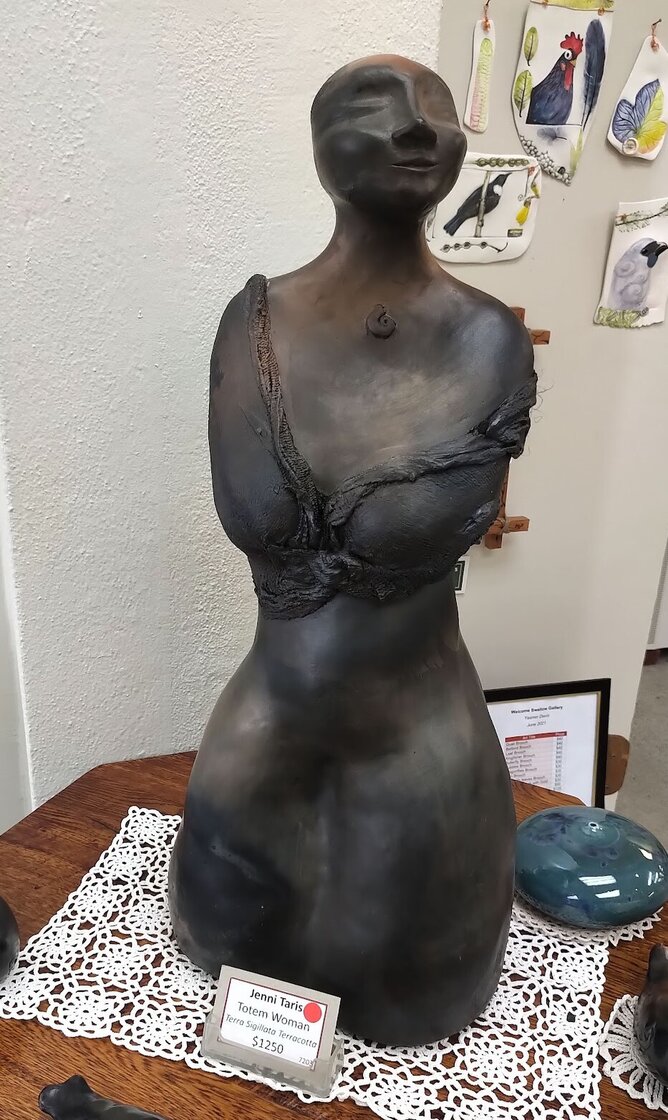 Jenni Taris's powerful Totem Woman, tells the story of all those women who have established their own great adventures. This Totem Woman is about to begin her adventures afresh now that she has left the Gallery to continue her escapades.