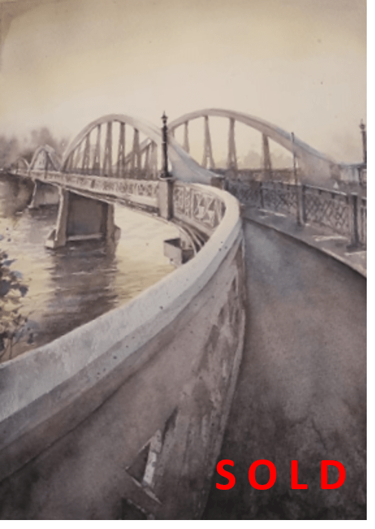 Hong Cumming, new Gallery artist has wasted no time in establishing her footprint at the Waikato Watercolourists II exhibition, selling the Catalogue cover composition, Romancing the Bridge earlier in the day. No wonder. It is a superb, highly collectable painting.