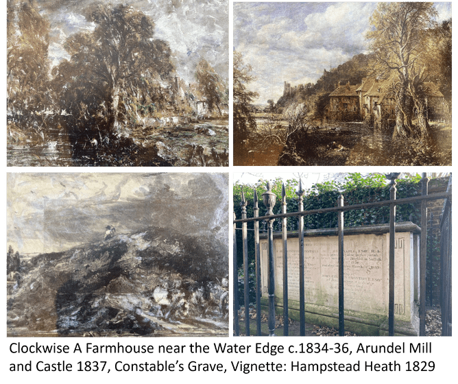 The last picture, interrupted by his death is ‘Arundel Mill and Castle’,1837. It is an wonderful composition: an English river, woods, hills and Arundel Castle pushed into the background. On 1st of April 1837 Constable died unexpectedly at the age of 60. He was buried alongside his wife Maria at St-John’s church, Hampstead where I often walk as I live not far from the old the graveyard. As I look at his grave, I have his landscapes of timeless imagination in my mind.