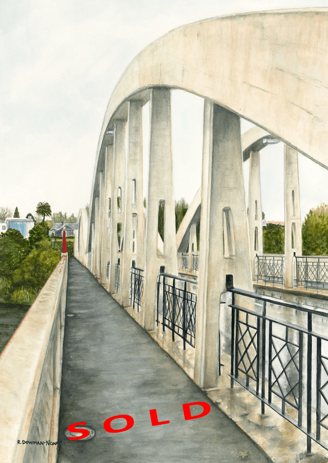 Of the many artistic renditions of the iconic Fairfield Bridge in Hamilton, a focus on the walk-way rather than the arches and roadbed, is rarely captured. Rebecca Dowman-Ngapo's watercolour composition, Walk With Me, admirably achieves this distinction. Recently sold from the Waikato Watercolourists II exhibition to a local collector, this painting that has garnered significant praise, has found it's forever home.