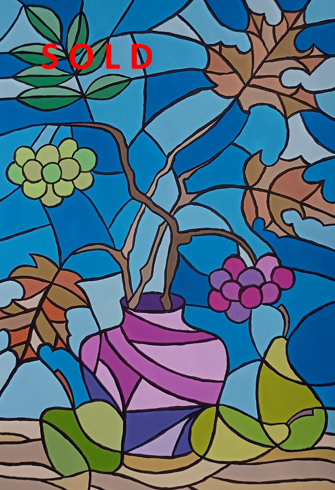 This beautifully coloured and highly stylized composition, Autumn Mosaic, is presented by SANDZ and Welcome Swallow Gallery artist, Deshan Walallavita. This painting quickly picked up the first red dot of the night!