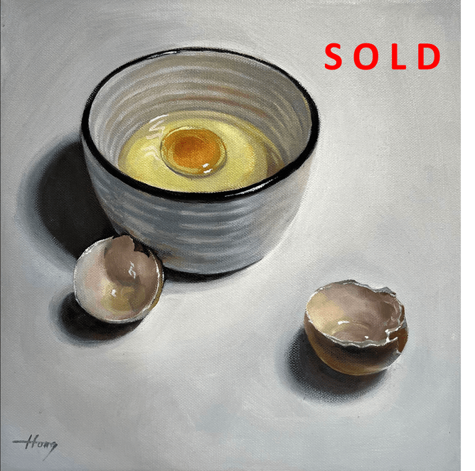 From the exhibition, Still Slices of Life, gallery artists Hong Cumming's outstanding composition Crack-up has been sold to a local collector who found the piece to be egg-citing. Its purchase poached the piece from the gallery. Sorry.