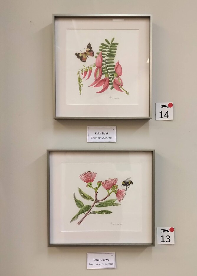 Gillian Receveur's Pohutukawa and Kaka Beak and Yellow Admiral are early sellers on preview day of the new exhibition at the Welcome Swallow Gallery, Botanica. Gorgeous compositions. Irresistible. SOLD.