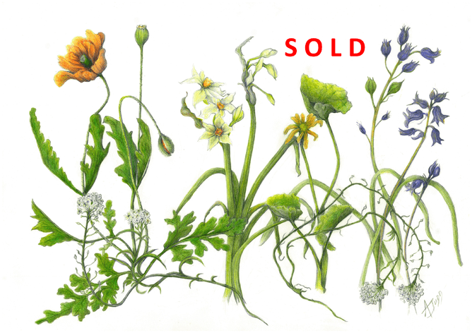 So exquisite, so delicate, so beautiful, is Annette Judd's Springtime Flowers, sold from the Botanica exhibition that has graced the gallery for the past 2 months. This graphite and colour pencil composition is a fine illustration of Botanical art featuring the following :