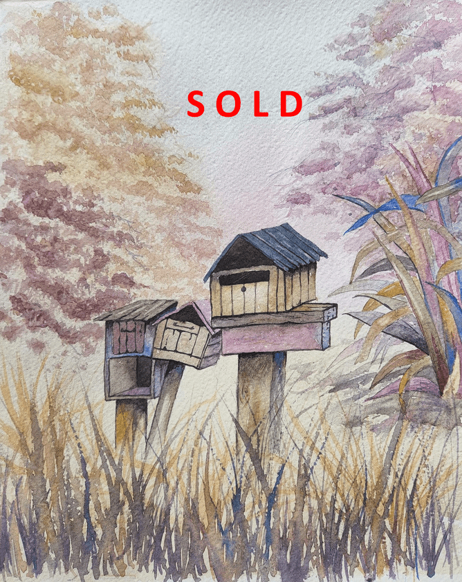 Letterbox is a lovely watercolour from gallery artist, Sandra Barlow who has delicately captured, in soft variegated hues of pink, brown and blue, a deceptively complex composition that offers a subtle if not hidden whimsical 'family portrait'. A gallery favourite, now posted to a private collection.