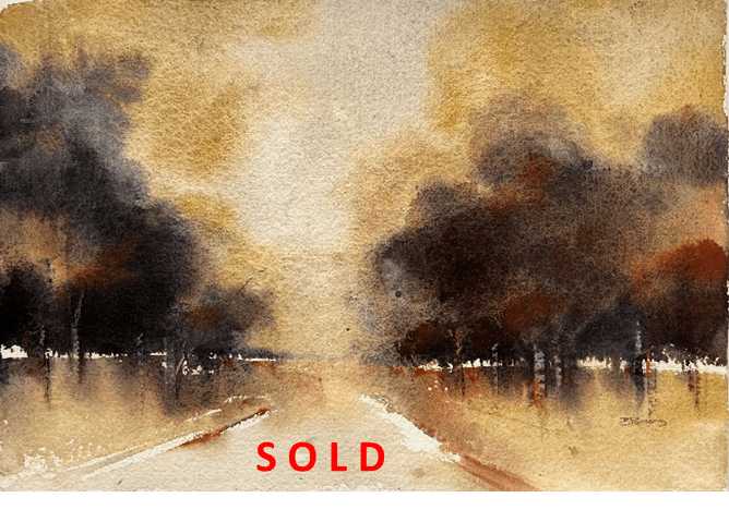 Fairlie Time by Bernadette Parsons catches the impressionist Turneresque style that Welcome Swallow Gallery regulars love. This composition projects into the future, not just anchored in the past. The misty vista before us is open yet unknown. This invitingly represents a pathway yet to be found but insists upon being explored. Sold to an Italian collector.
