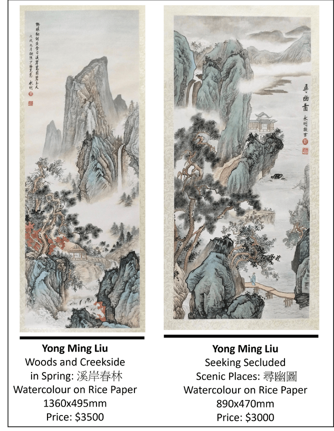 These two very special scrolls by gallery artist Yong Ming Liu for the Exhibition, Chinese Art: Inheritance & Innovation have been sold to a European collector who recognizes their intrinsic value as representative of Chinese art and the cultural traditions that date back to the Ming Dynasty. To date this exhibition has been the Welcome Swallow Gallery's most successful, selling 90% of the compositions available. The sale of these two magnificent scrolls, painted in the claborate tradition, or realist style, represents an important mark in the history of the gallery.