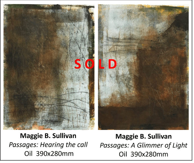 From the As You Like It exhibition, gallery artist Maggie B. Sullivan's compositions entitled Passages: Hearing the Call and Glimmer of Light have added an atmospheric cadence to gallery for viewers to both admire and ponder. Now sold to an enthusiastic buyer of her work.