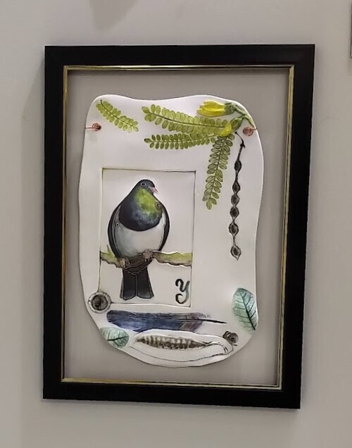 At this time of year, Yasmin Davis has, for many years presented her signature Koru with original watercolour ceramics that are much loved by gallery supporters. Featured here is her magnificent major composition of a Kereru surrounded by bucolic bliss. Sold today along with approximately smaller 75 pieces leaving the gallery through November and December.