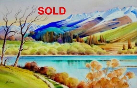 From the Our Times exhibition. Sue Currie's evocative and highly stylized composition, Early Winter, Lake Hayes has now found it's forever home. This is not surprising for the buyers who are very familiar with the lake and landscape rendered in this splendid watercolour.