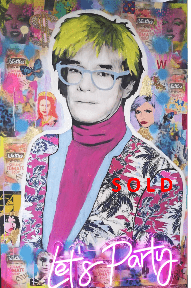 Debra Thompson’s contemporary composition, Let’s Party from the exhibition, As You Like It, has drawn many admiring comments from visitors to the gallery. However, it is now time for Andy Warhol to party on elsewhere, in what will be his new home. Its been a pleasure to host you in our own ‘factory’.