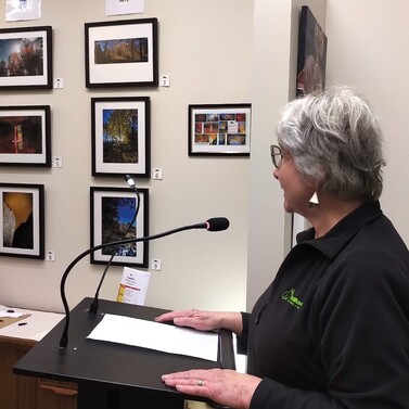 Dorothy Wakeling and Sylvia Sinel from the Sculpture Park introduced, to the large gallery audience, the Fleeting Moments photographic competition expressing deep satisfaction with the way in which many people had embraced the challenge of capturing the Sculpture Park in Autumn. Mark Hamilton who judged the competition presented the winners (see below) with their prizes while praising the overall quality of the submissions.