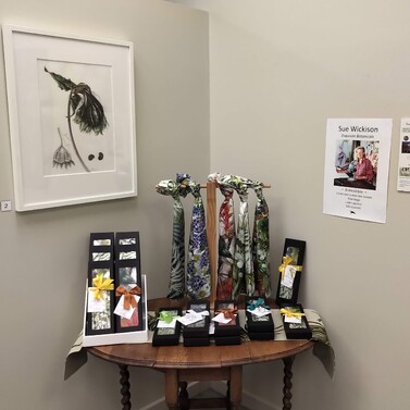 Alongside the brilliant art work (see Catalogue below) Sue made available products such as scarves, aprons, tea-towels and toke-bags, all featuring her extensive art collection.