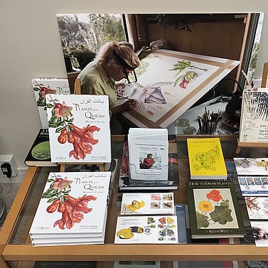 Recently the exhibition was seen by over a million visitors where it was installed at Kew Gardens, London. "From a tiny mustard seed to the majestic date palm, the Kew Gardens exhibition showcases paintings from the book "Plants of the Qur'an" combining the skills of the northern hemisphere senior Kew Botanist Dr Shahina Ghazanfar (who has researched and written the book) and southern hemisphere Botanical Illustrator Sue Wickison.