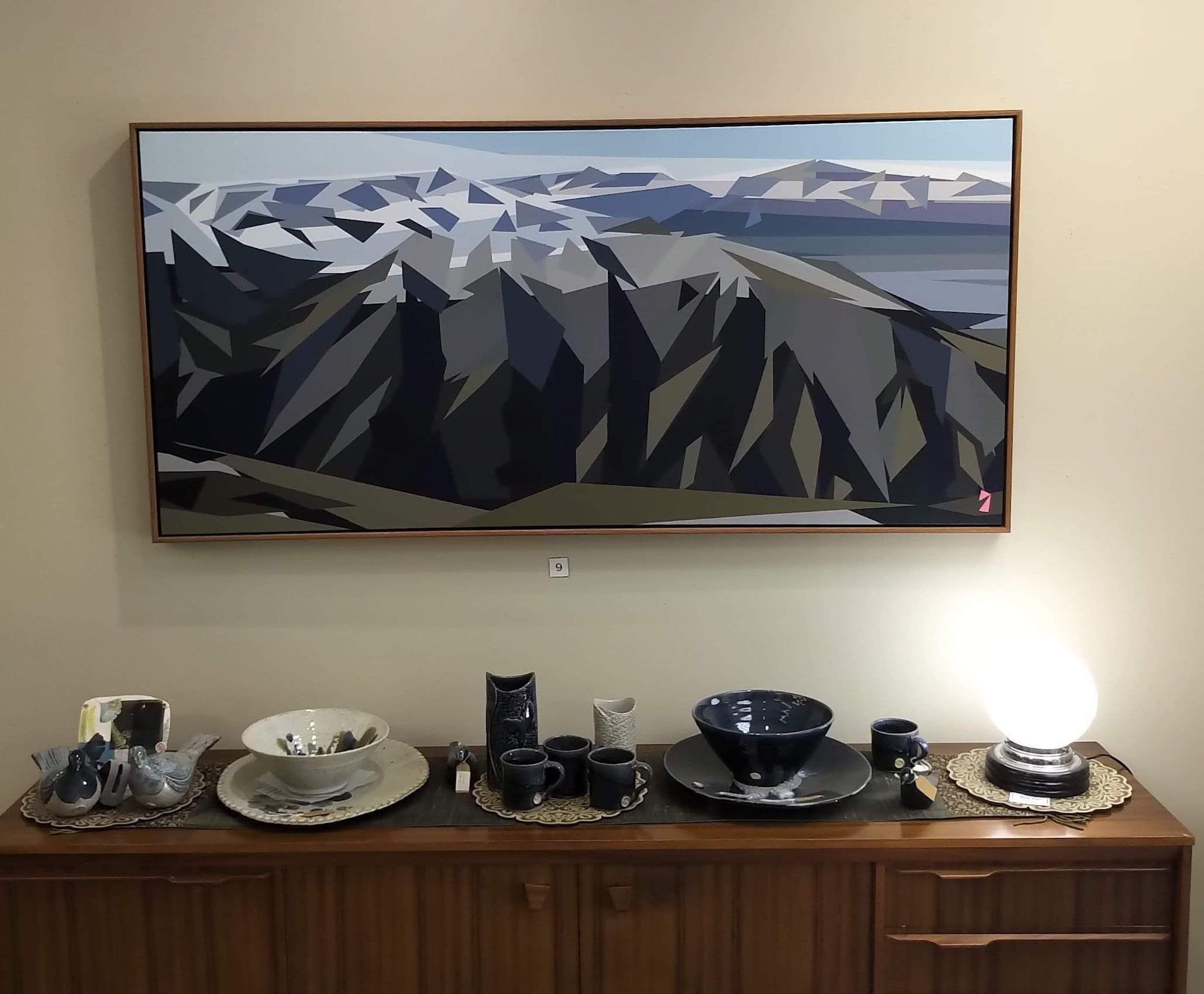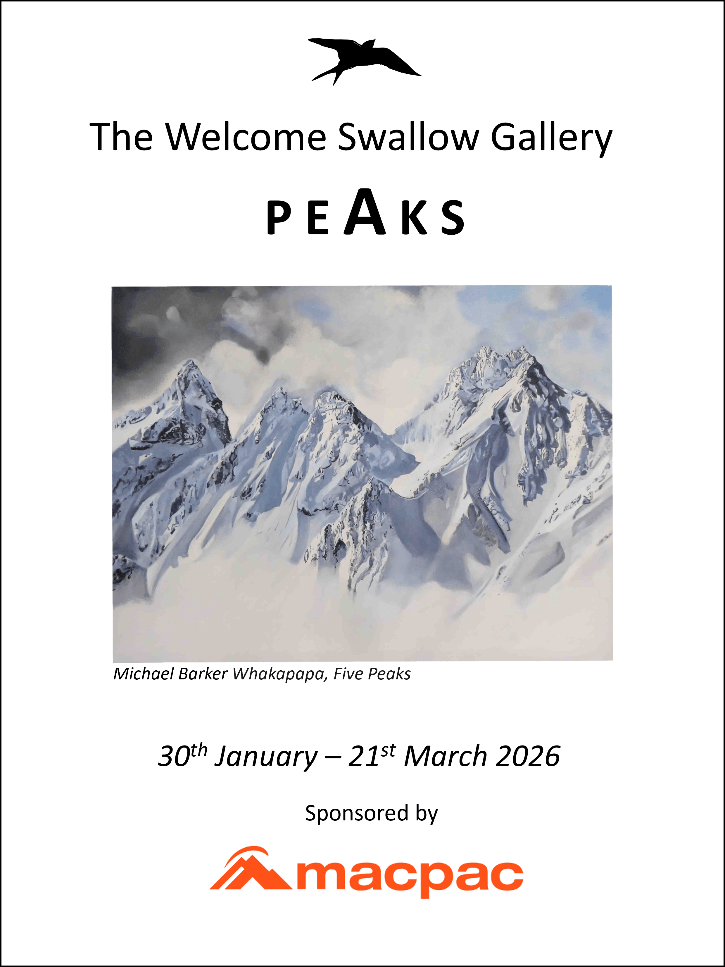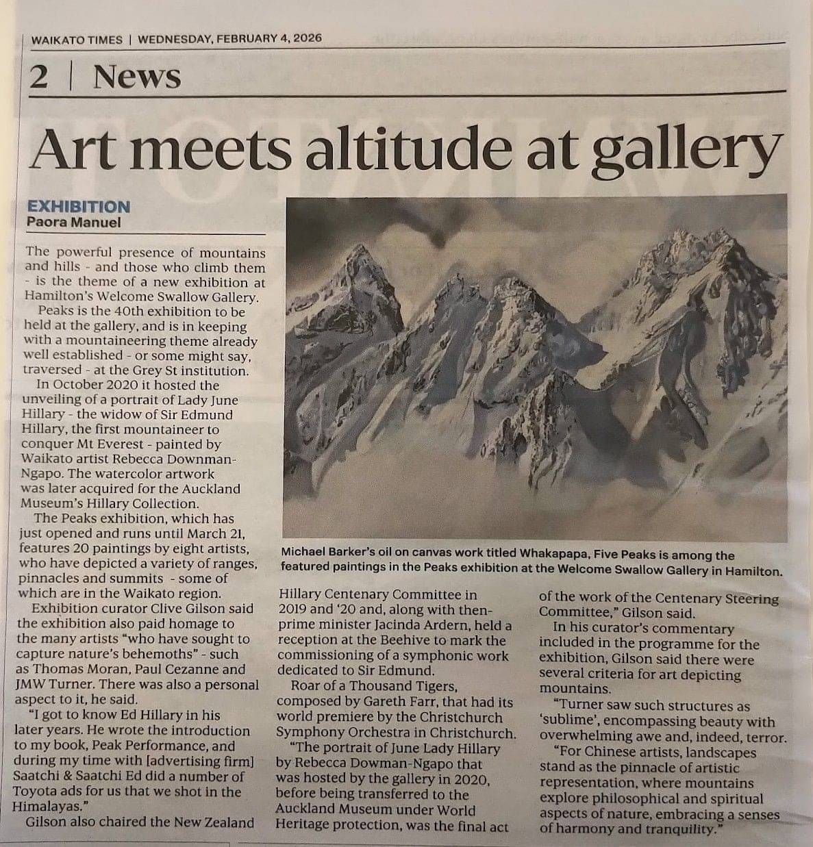 A hot summer evening saw the opening of the PEAKS exhibition, Welcome Swallow Gallery’s 40th rendition of original art. The evening began with gallery curator, Clive Gilson expressing the importance of sponsorship support of the arts in difficult times. He noted that the sponsors of the PEAKS exhibition, by MACPAC, a national organization, had been especially generous and a major reason why the exhibition was able to come to life. Gilson also referred to the gallery’s intention to make an ongoing contribution to New Zealand art history and in particular whether there is a defined form of New Zealand art (see editorial comment pdf below).