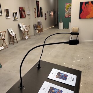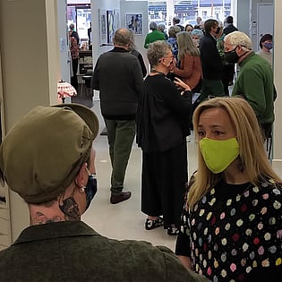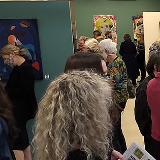 Photography captures, for future generations, the opening of the Ambiguity exhibition that took place during the period of a mask mandate. As the number of attendees crept close to the maximum number of 100, the current limit for social gatherings, all those who joined the launch were suitable attired. Trust Board member Clive Gilson, who welcomed the guests, pointed out that the very title of the exhibition offered many interpretations that might usefully shed light on the current uncertainties that all faced. On behalf of the eleven artists showing in the exhibition, Sylvia Sinel shared her own artistic journey, indicating that the notion of Ambiguity during the period of a global pandemic resonated with all art forms, including her own.